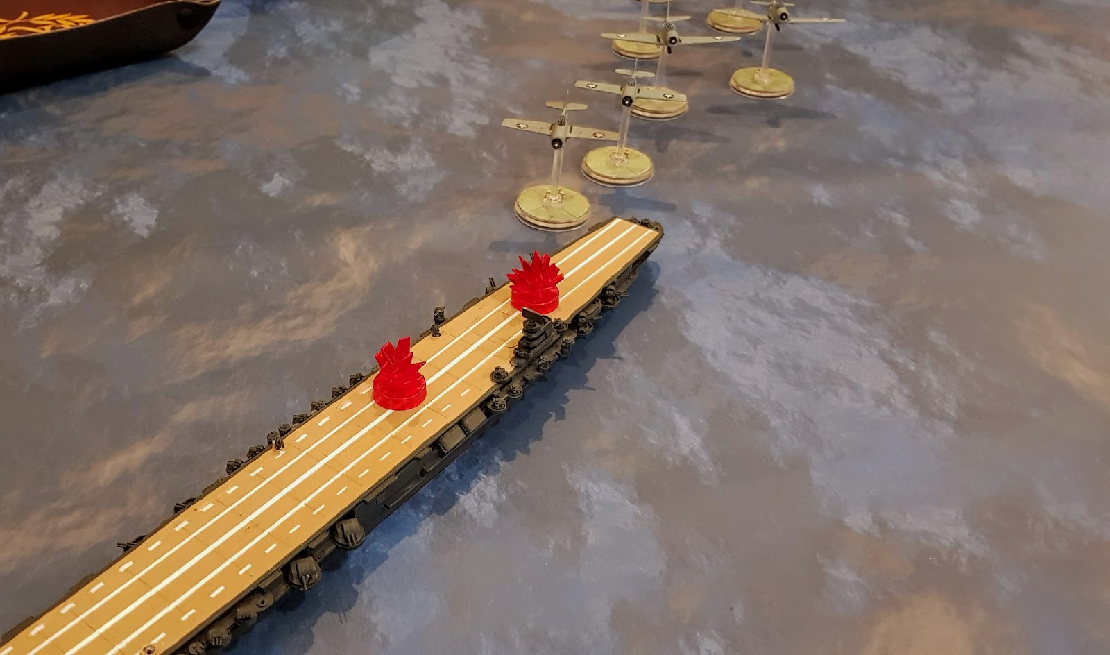 Each side had at disposal 6 plane flight of fighters (F4F Wildcat vs. A6M2 Zero), 6 plane flight of recce/bombers (Dauntless Aichi Val) and 6 plane flight of torpedo bombers (Davastators vs Kates).