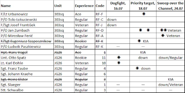 F/Lt Urbanowicz and Sgt Frantisek strafe two of three bombers and successfully make them disadvanteged when P/O Feric covered thier backs. When the German fighters had seen their mistake they divide the force, two fighters burn advantage to help bombers immediately when another pair continued a planned manoeuvre.